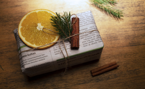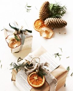 2. Tuunaa lahjapakettisi edustuskuntoon! Sido rusettiin mukaan pieni havunoksa ja pieni pätkä eriväristä nauhaa. Uniikin lisän saat lisäämällä kuivatettuja hedelmäviipaleita – esimerkiksi omena ja appelsiini käyvät tähän tarkoitukseen erinomaisesti! Mitä yksinkertaisempi lahjapaperi on, sitä enemmän lisäämäsi yksityiskohdat korostuvat edukseen!