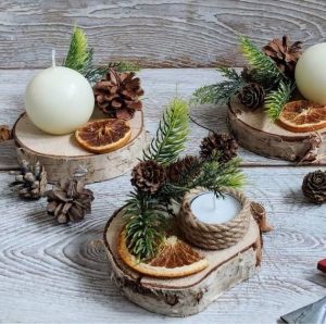 Koristele joulu kotiin helposti ja edullisesti! Joulutunnelmaa saat esimerkiksi havuilla, kävyillä, kuivatuilla sitrushedelmillä ja nyt-niin-trendikkäillä puukiekoilla.