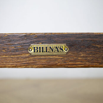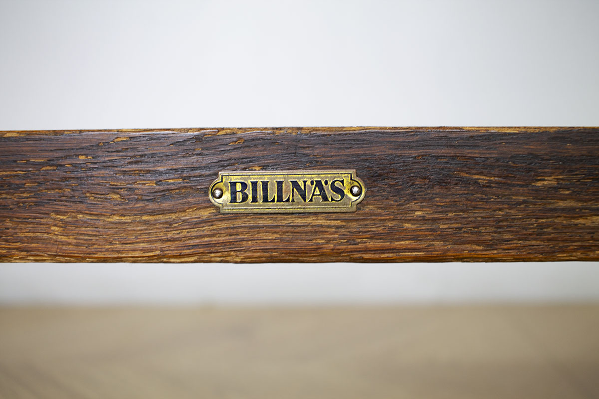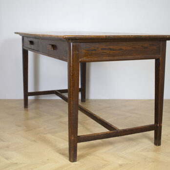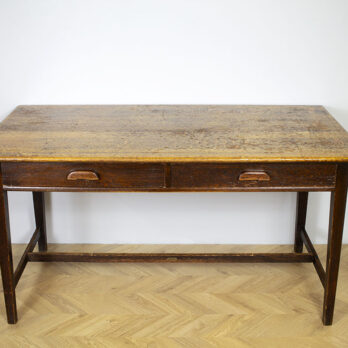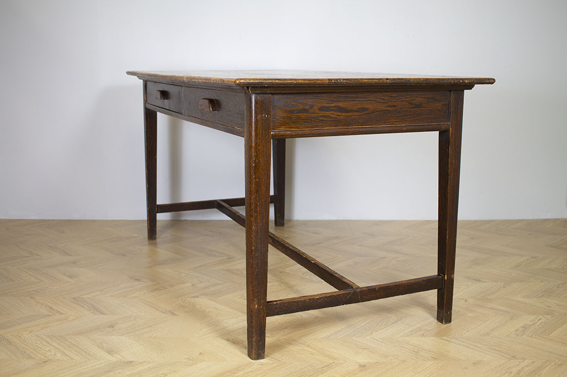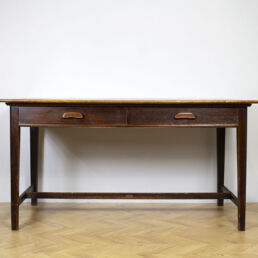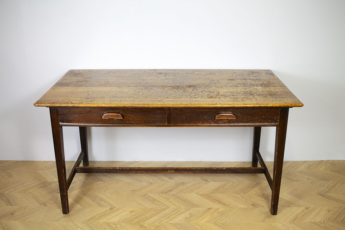 1900-luvun puolivälin tamminen Billnäs-työpöytä. Työpöydässä kaksi vetolaatikkoa. Pöydässä kulumaa.