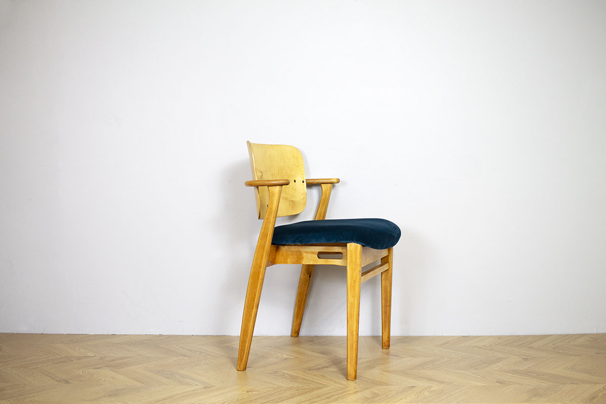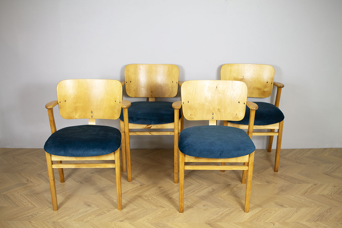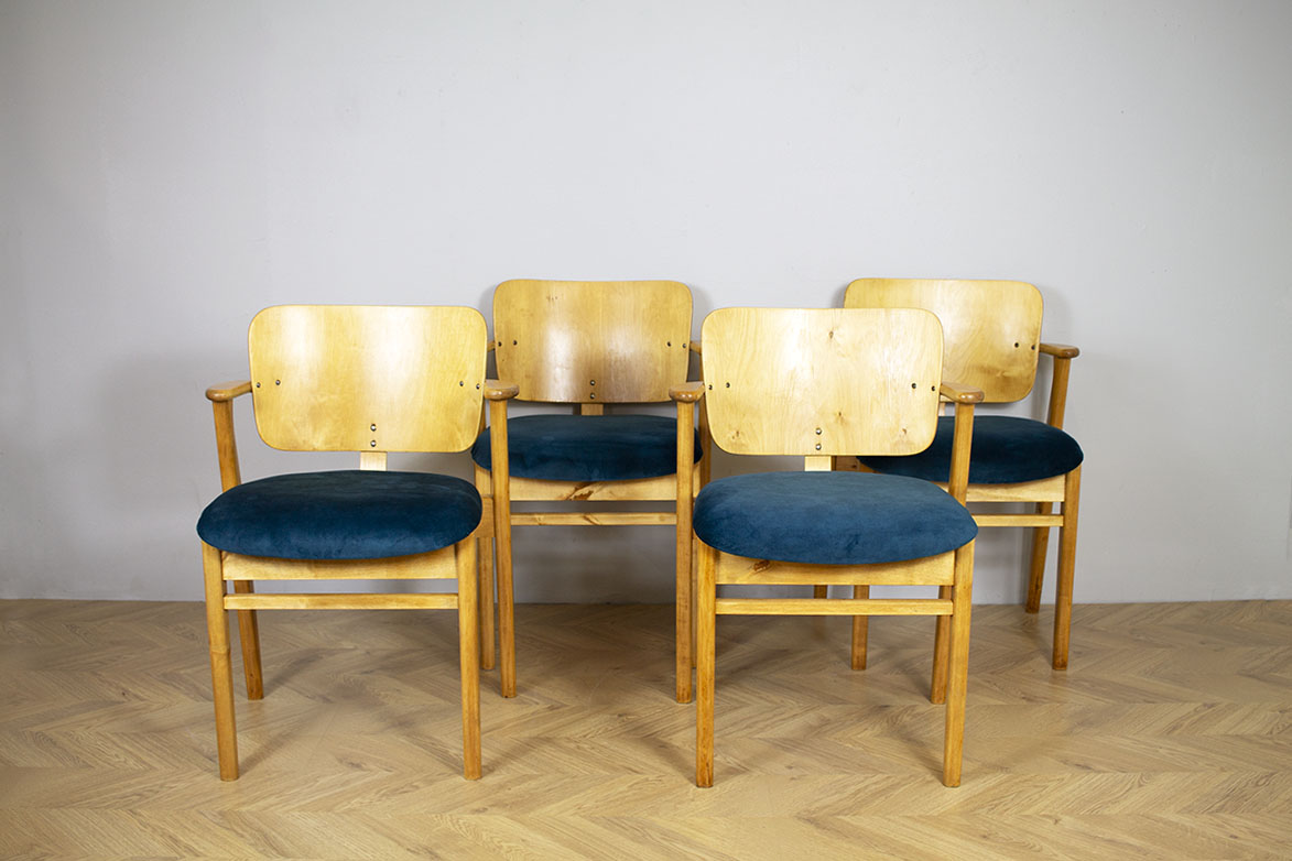 4 kpl 60-luvun Domus-tuoleja. Vaaleaksi lakattua koivua ja istuimissa samettiverhoilu. Tuolit myydään yhdessä.