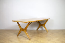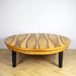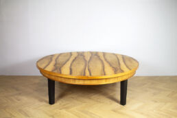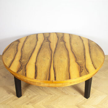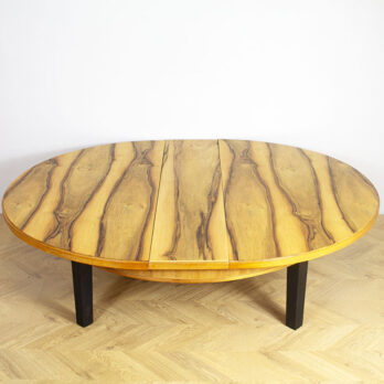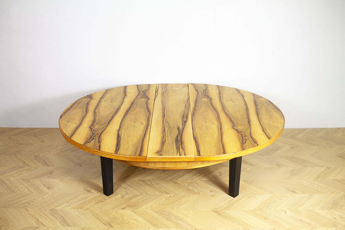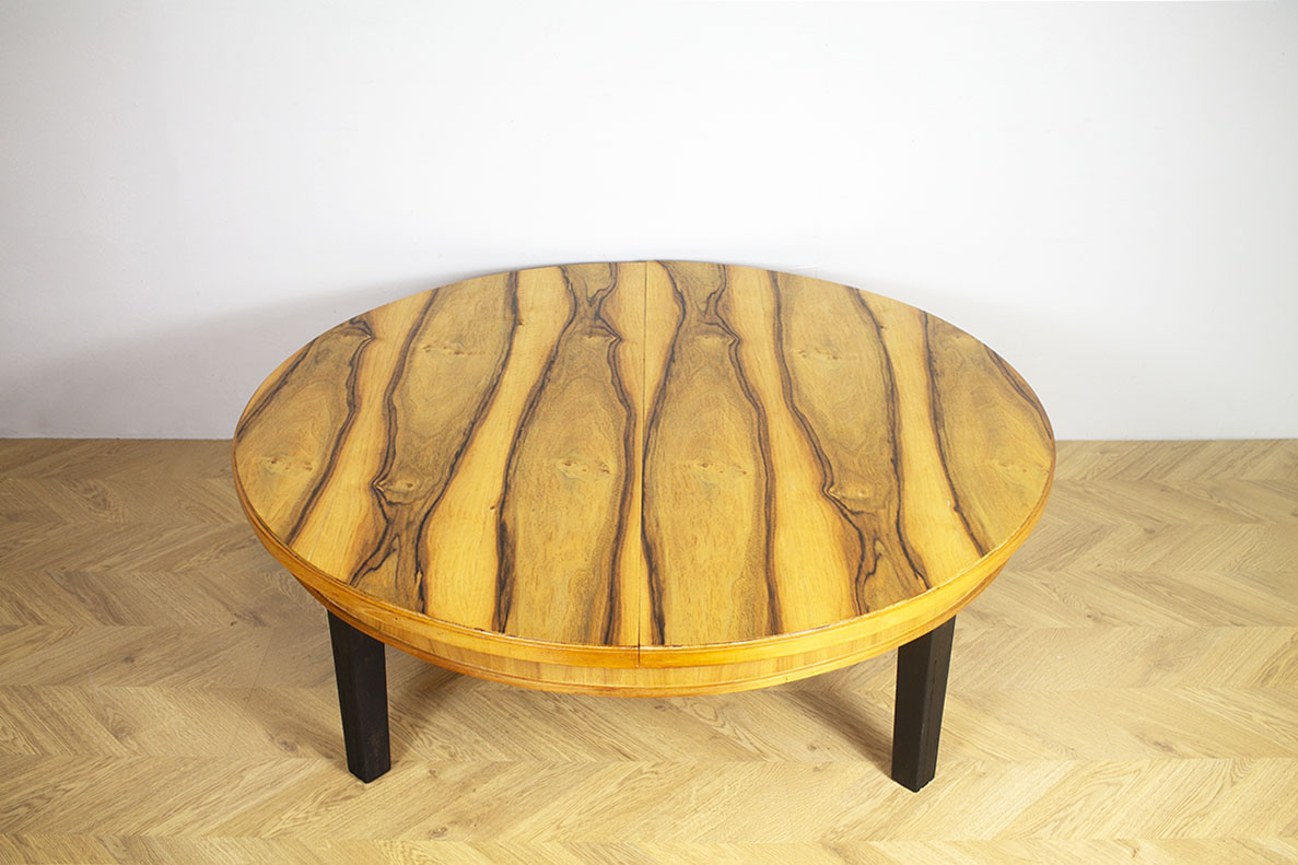 Jalopuuviilutettu jatkettava sohvapöytä. Jalat maalattu mustaksi ja kansi vahattu värittömällä vahalla.