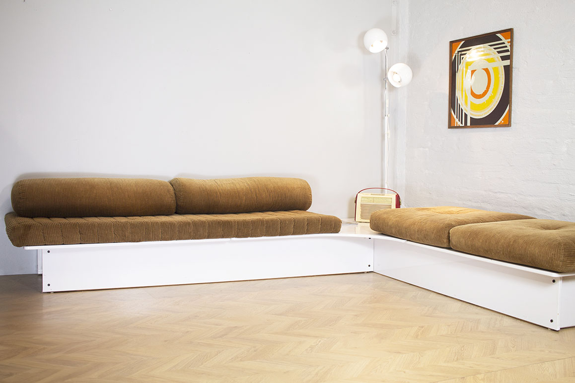 70-luvulla valmistettu kulmasohva. Sohva on oletettavasti Skannon valmistama. Sohva koostuu 5:stä eri osasta: kahdesta sokkeli -ja kolmesta tasolevystä. Sohvan pinnat päällystetty kiiltävällä valkoisella vinyylillä. Ruskeat vakosamettiset tyynyt ovat alkuperäiset. Sohvassa lievää kulumaa ja pieniä jälkiä.