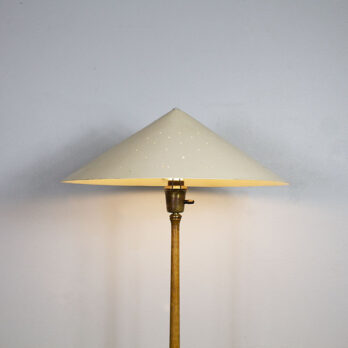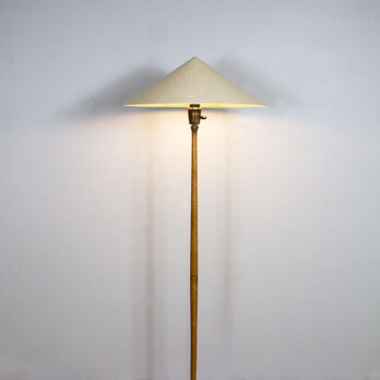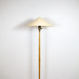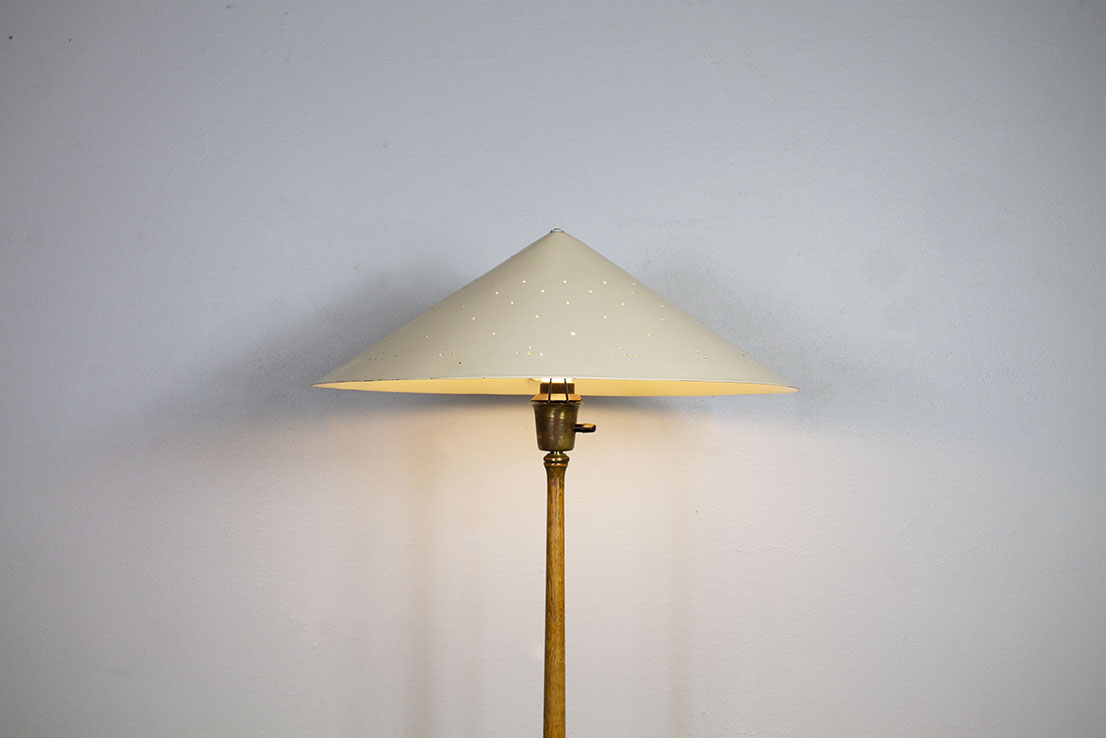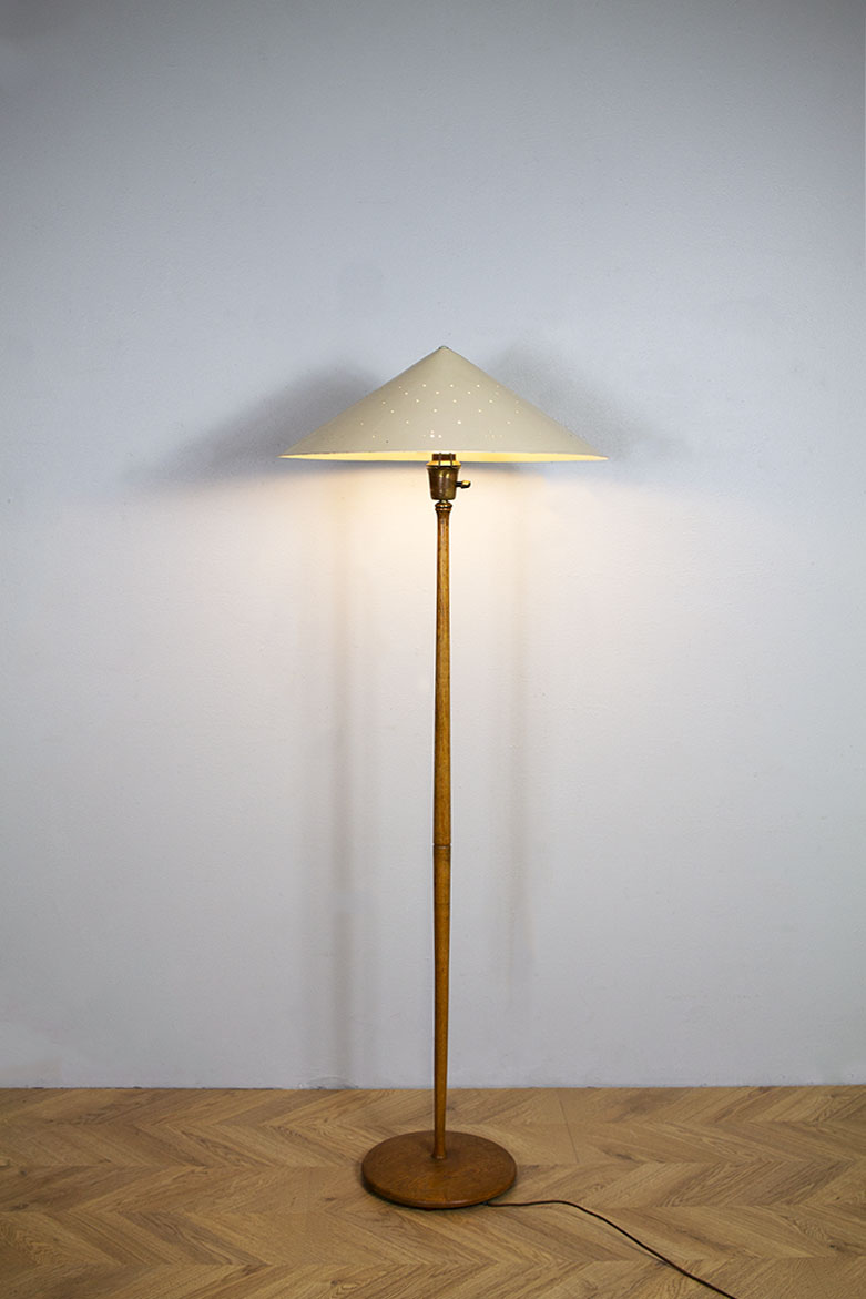 Ruotsalaisvalmisteinen tamminen lattiavalaisin metallisella varjostimella.