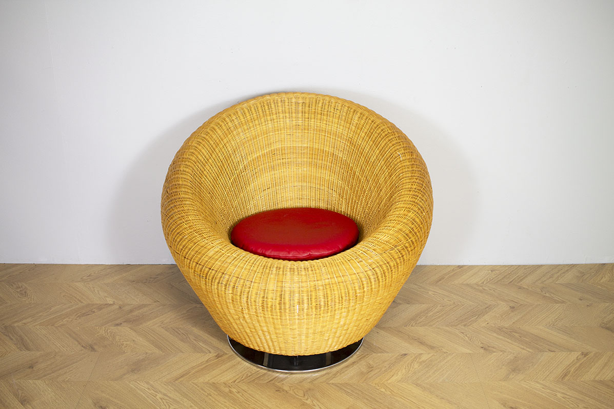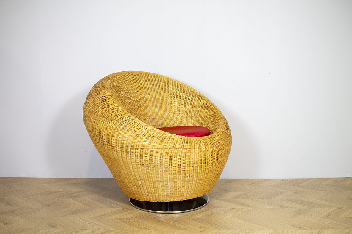 Oletettavasti Japanilaista käsityötä oleva rottinkituoli. Tuolin alle asetettu krominen pyörivä jalusta. Istuintyyny nahkaa.