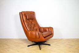 Oletettavasti Japanilaista käsityötä oleva rottinkituoli. Tuolin alle asetettu krominen pyörivä jalusta. Istuintyyny nahkaa.