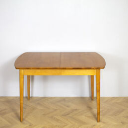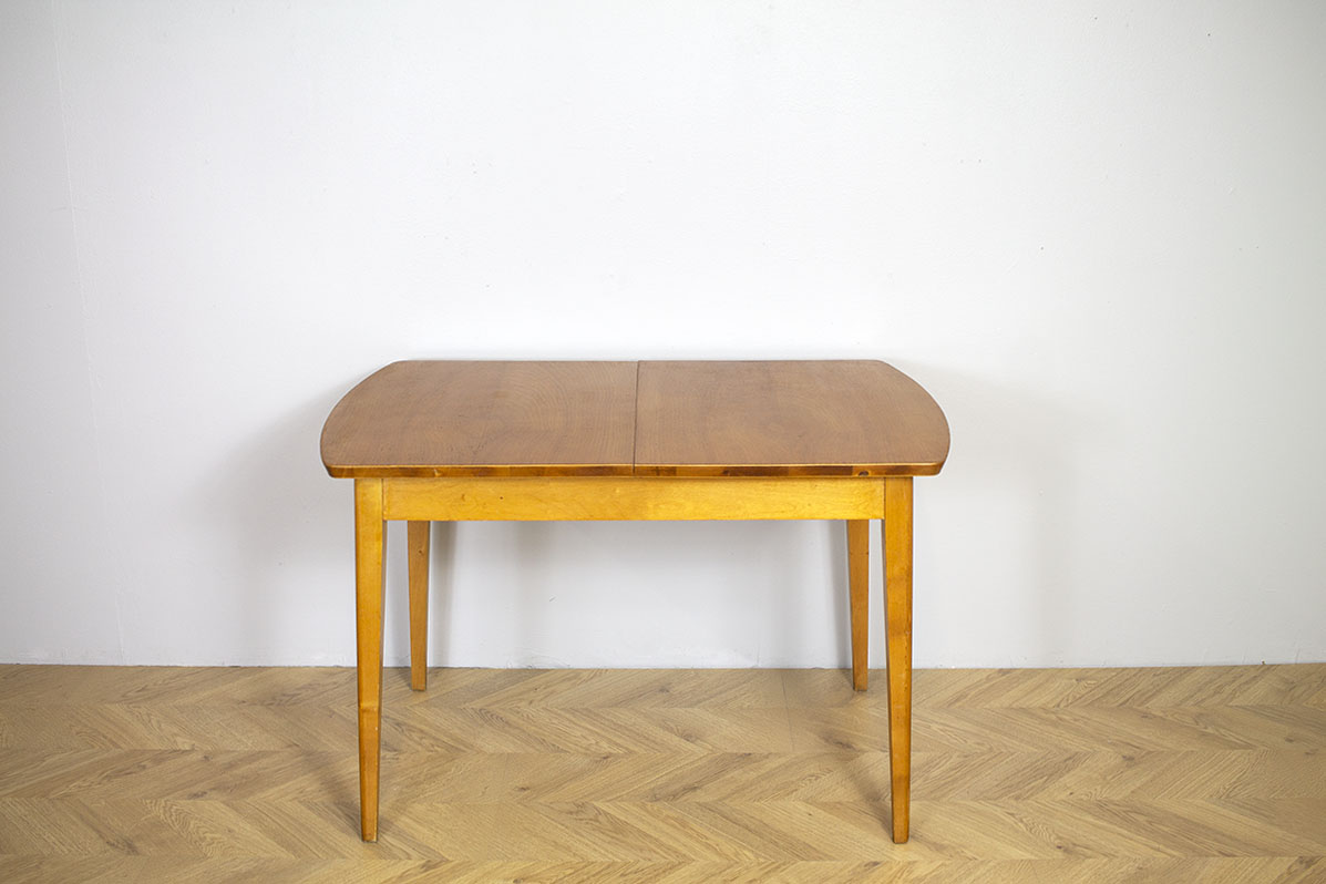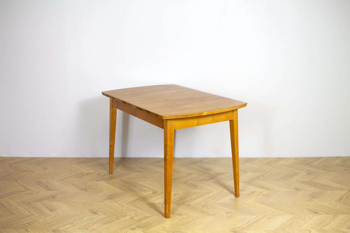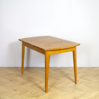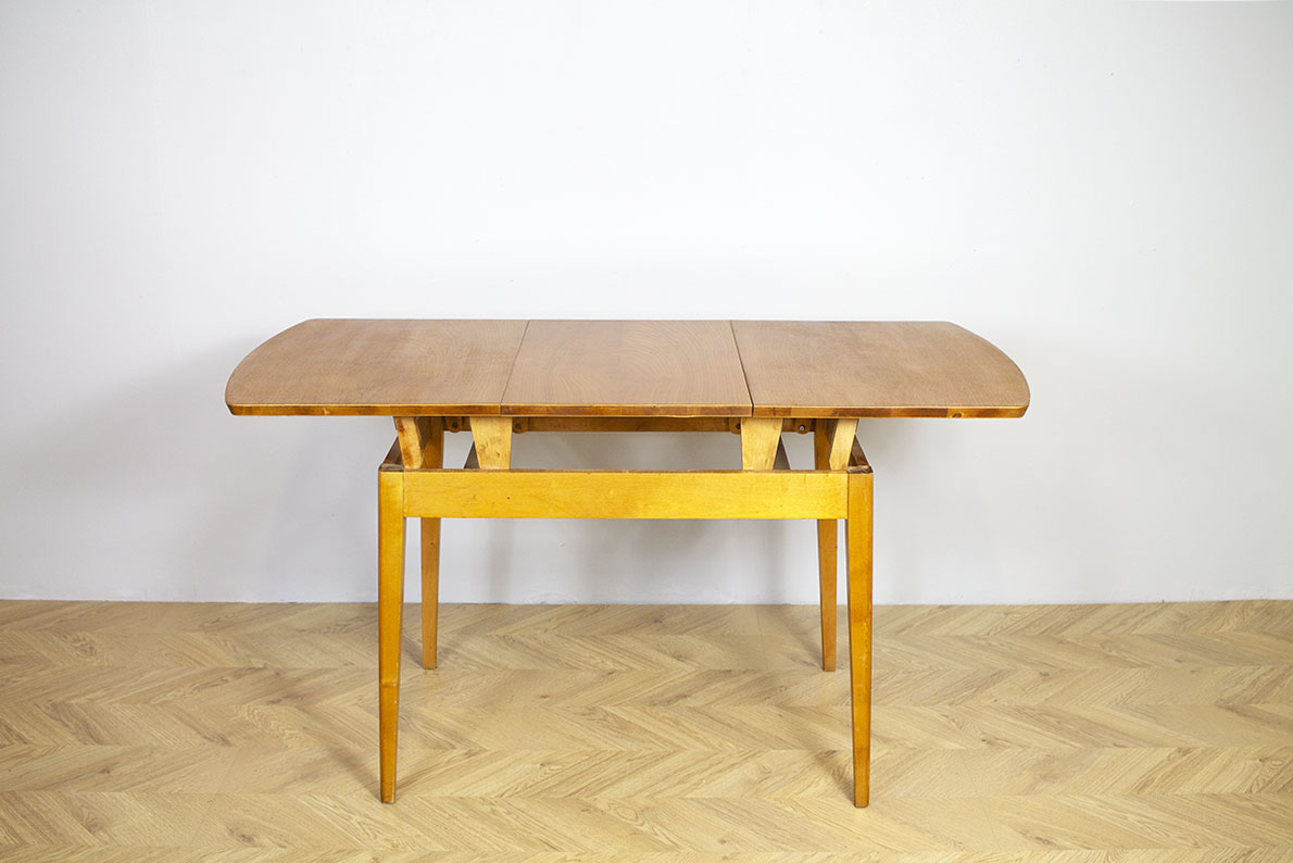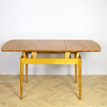 1900-luvun puolivälissä valmistettu sohva-/ruokapöytä. Pöytä muuntautuu sohvapöydästä ruokapöytä korkeuteen jatkopalalla. Runko koivua ja pöytätasot viilutettu jalopuulla.